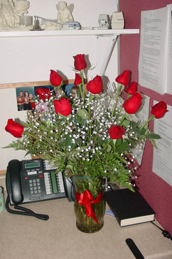 (Click on the rose and you will see the other 11 that came along with it on my desk at work.) This is the very first time in my life that I have ever received 1 dozen long stem roses. They are amazing and the person that gave them to me is even more amazing! I was only told on the card "from somebody special" but within moments I knew, deep down, I knew there was only