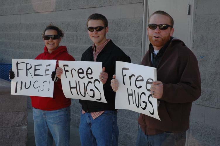 We only had maybe 10% of the people have a negative view of what we were doing. But for the most part people were amazed that we were just out there to spread hugs! I gave out sooo many hugs! I would say about 40-50% of the people that I offered hugs to, took me up on the offer! I had no idea that it would be so well received. I was smiling ear-to-ear and in the end felt that I had been apart of a pretty amazing thing! I was so high from the experience I couldn’t stop talking to everyone about it! One kid thought it was such a great idea he asked if he could take the idea to his church group at New Life!