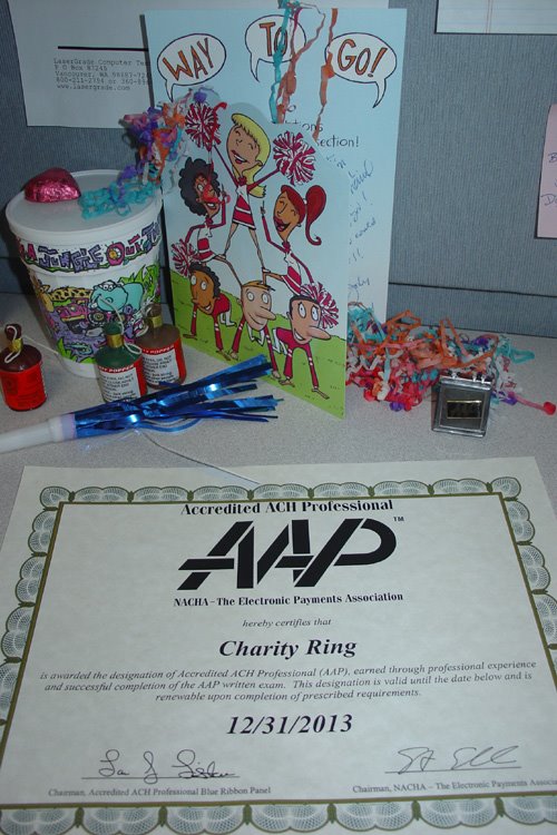 12.16.08 : AAP Certification - It came in! So it's official! I can sign my name Charity Ring, AAP. lol I will say that it felt more fulfilling to have the unofficial pass then when I got the piece of paper. I guess because I had already gotten my promotion and raise. So it didn't change much having the piece of paper. But as my mom pointed out, if I didn't get certified then I would have felt it! I plan on going out with a few of my coworkers to celebrate. We had it planned for Wednesday but with the snow we have to put it off. And with the holidays I didn't want to stress out about figuring out a good day for everyone. So we're hoping to go karaoking January 9th or something. I think that would be fun! Here's a pic of my certification and the card everyone got for me when I passed the test, and you can sort of see the box with my pin in it. :) yay!